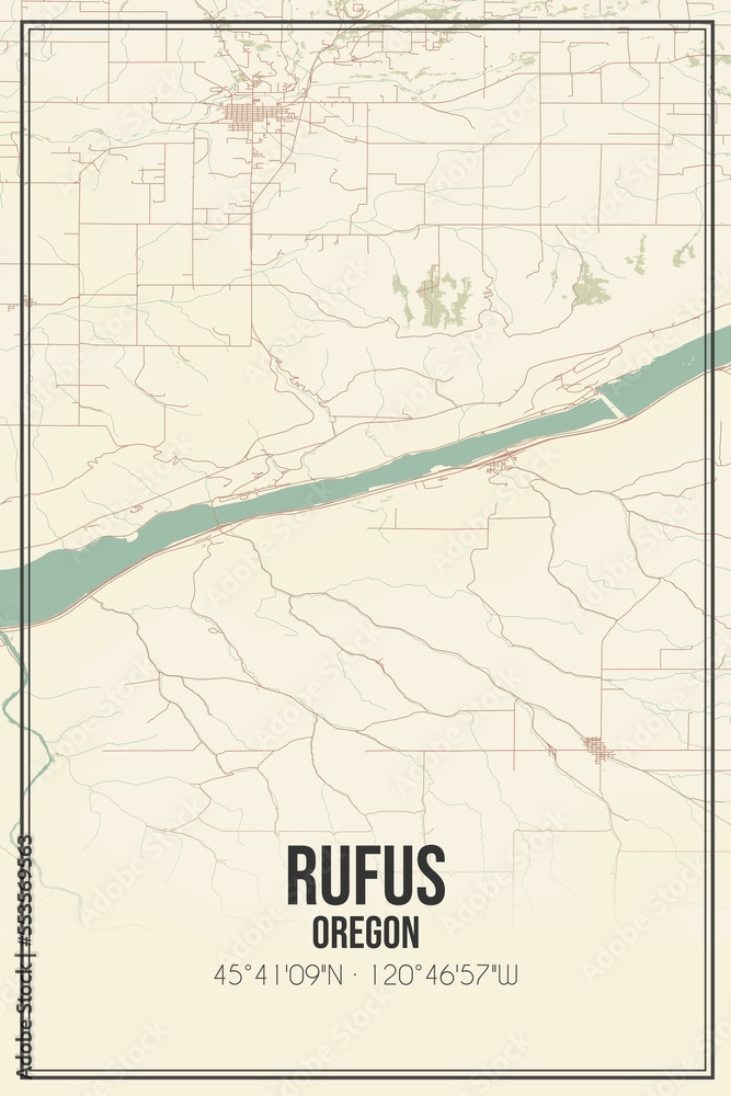 Vintage Rufus Oregon Map Poster, Rufus OR City Road Wall Art Print